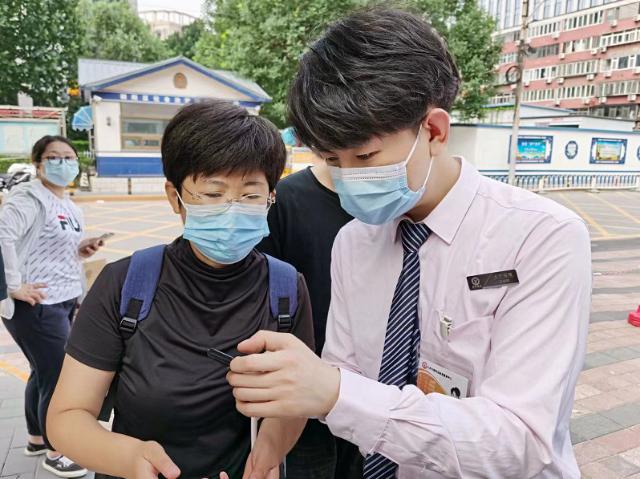 在朝阳区政务服务中心门口,首先有工作人员查验行程卡,确定14天内没有经过中高风险地区的记录才放行。再依次查验北京健康宝、检测体温,全部没问题方可入内。