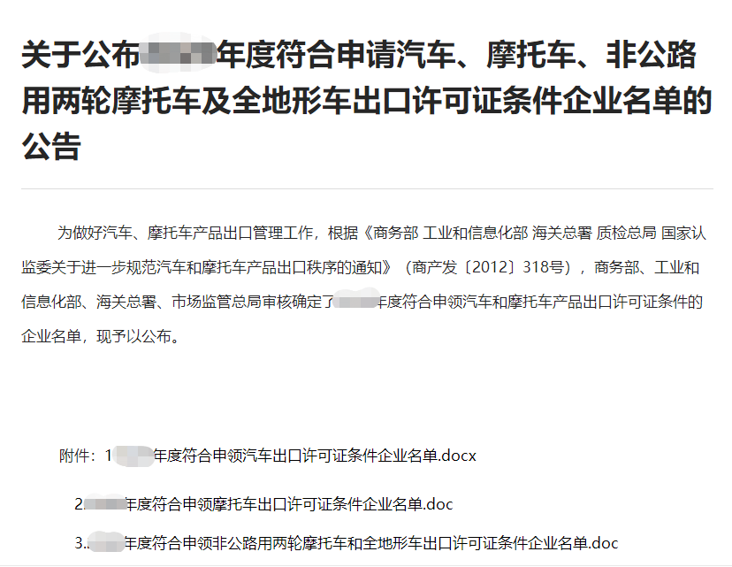 | 受理条件 | 根据商产发〔2012〕318号文《商务部工业和信息化部海关总署质检总局国家认监委关于进一步规范汽车和摩托车产品出口秩序的通知》,为进一步转变汽车和摩托车出口发展方式,提高出口增长的质量和效益,促进产业健康发展,商务部、工业和信息化部、海关总署、质检总局、国家认监委决定对汽车和摩托车(含非公路用两轮摩托车、全地形车)生产企业实行出口资质管理,对出口经营企业实行生产企业授权经营管理。 受理条件:1、汽车、摩托车生产企业应列入工业和信息化部《车辆生产企业及产品公告》;具备有效的国家强制性产品认证(CCC认证) 2、低速汽车生产企业应列入工业和信息化部《车辆生产企业及产品公告》 3、非公路用两轮摩托车生产企业应当具备有效的IS09000企业质量管理体系认证;获得国家推行的自愿性产品认证或相关国际认证 4、全地形车生产企业应具备有效的IS09000企业质量管理体系认证;获得相关国际认证 5、所有产品类别的生产企业具备与出口保有量相适应的维修服务能力 6、境外销售维修服务网点及海外设厂总体情况说明 7、海外售后服务协议 8、企业线上提交,审核机关线上受理,商务部官网线上公示办理结果 9、材料须齐全,所有复印件加盖公章后再上传系统。 | ||