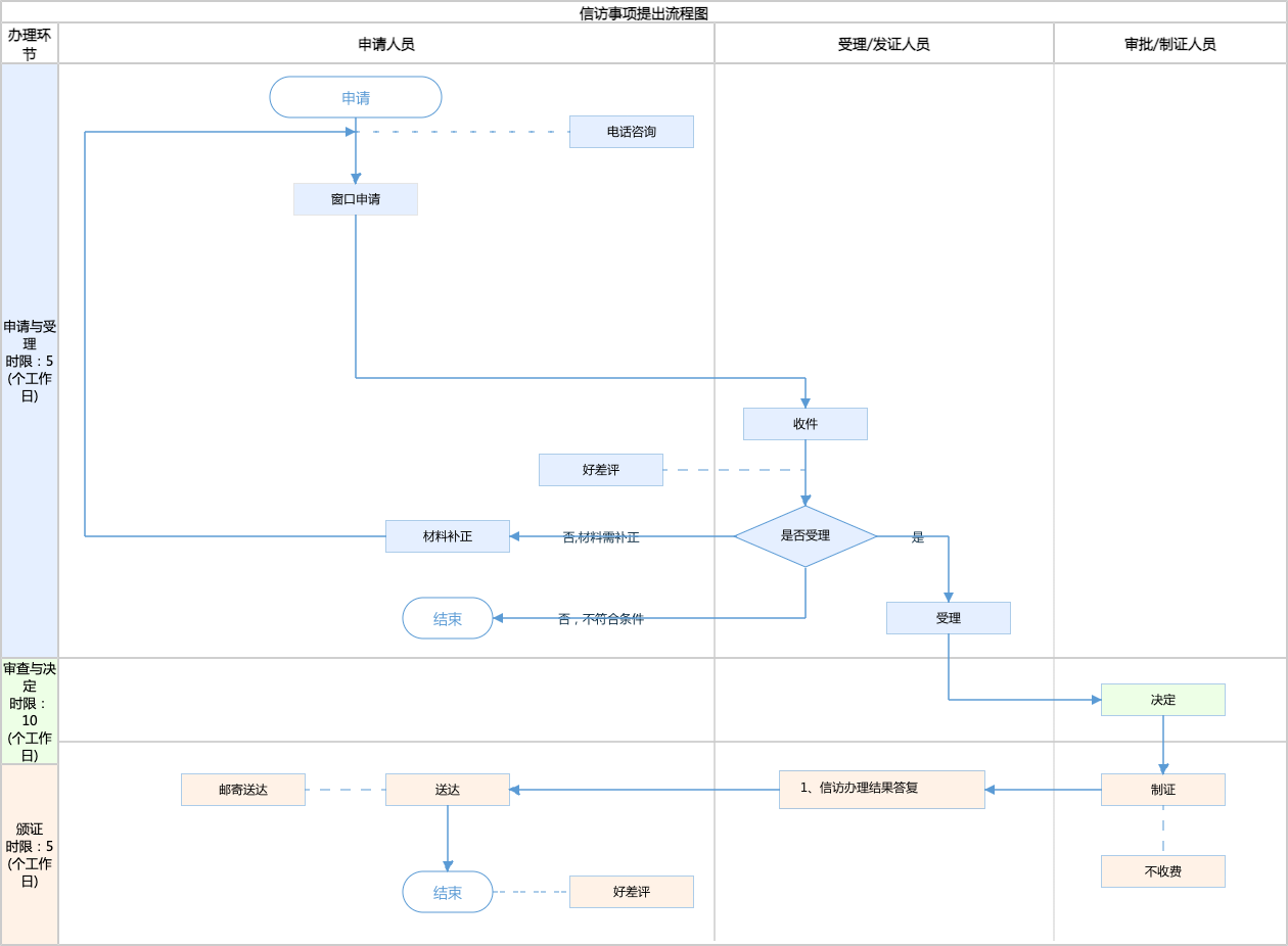 | 受理条件 | 公民、法人或者其他组织可以采用信息网络、书信、电话、传真、走访等形式向市、区人力资源社会保障局反映情况,提出建议、意见或者投诉请求,市、区人力社保局应当依规依法处理。信访部门收到信访事项,应当予以登记,并区分情况,在15日内分别按照下列方式处理: 1.对依照职责属于本级机关或者其工作部门处理决定的,应当转送有权处理的业务部门;情况重大、紧急的,应当及时提出建议,报请本级党组决定。 2.涉及下级机关、单位或者其工作人员的,按照“属地管理、分级负责,谁主管、谁负责”的原则,转送有权处理的机关、单位。 3.对转送信访事项中的重要情况需要反馈办理结果的,可以交由有权处理的业务部门办理,要求其在指定办理期限内反馈结果,提交办结报告。来源(《信访工作条例》第十七条、第二十二条) | ||