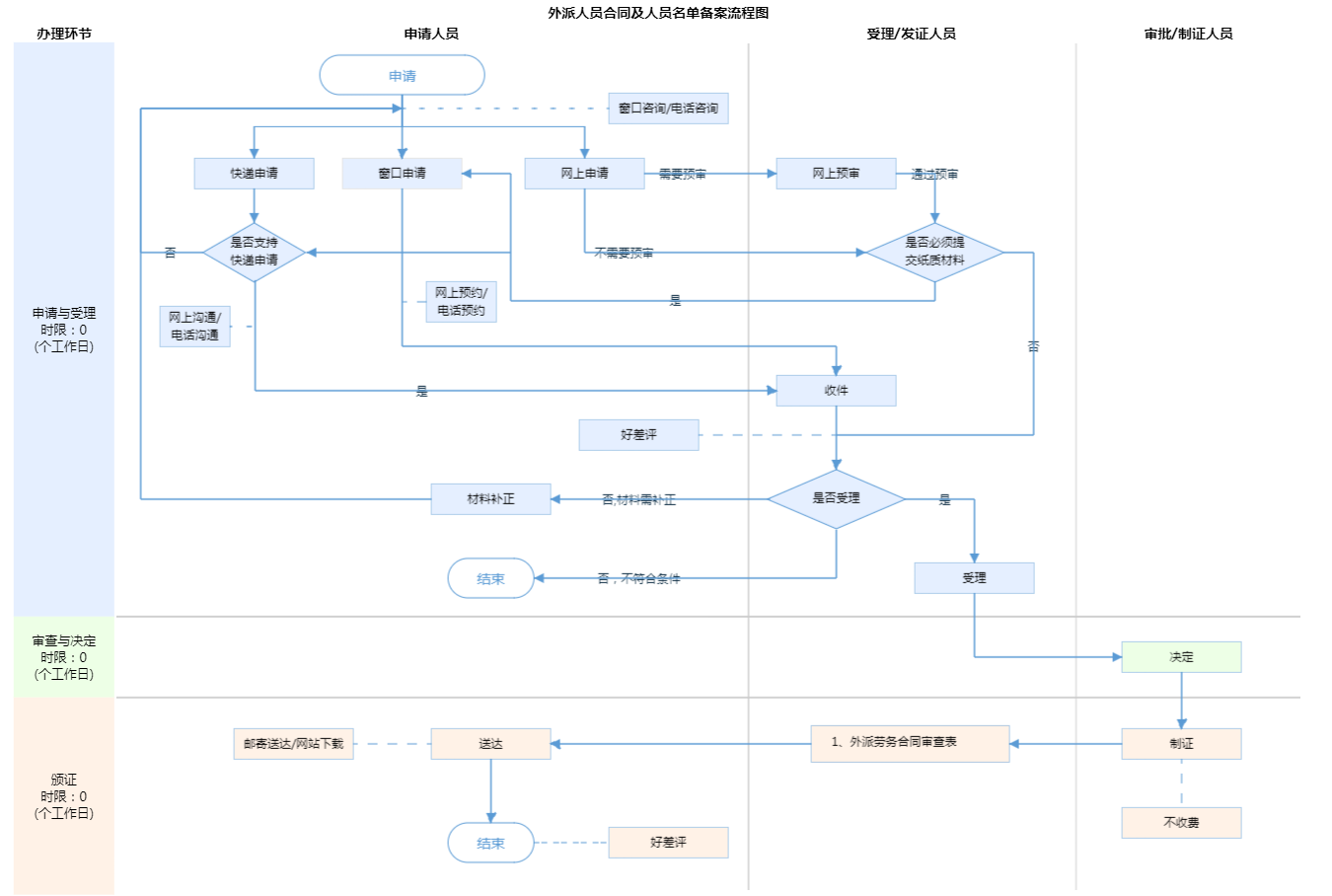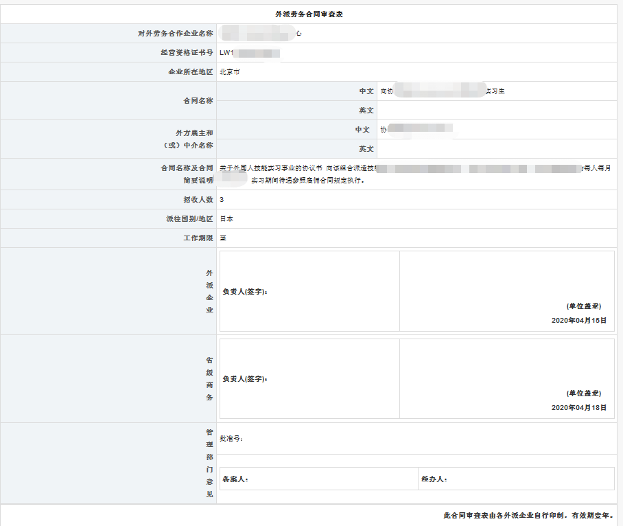 | 受理条件 | 1.对外劳务合作企业应当自与劳务人员订立服务合同或者劳动合同之日起10个工作日内,将服务合同或者劳动合同、劳务合作合同副本以及劳务人员名单报负责审批的商务主管部门备案。负责审批的商务主管部门应当将用工项目、国外雇主的有关信息以及劳务人员名单报至国务院商务主管部门。(来源:《对外劳务合作管理条例》第二十六条); 2.材料齐全,填写完整,真实有效; 3.申请材料按要求签字、盖章,且签章内容与申请材料所载内容一致。 | ||
