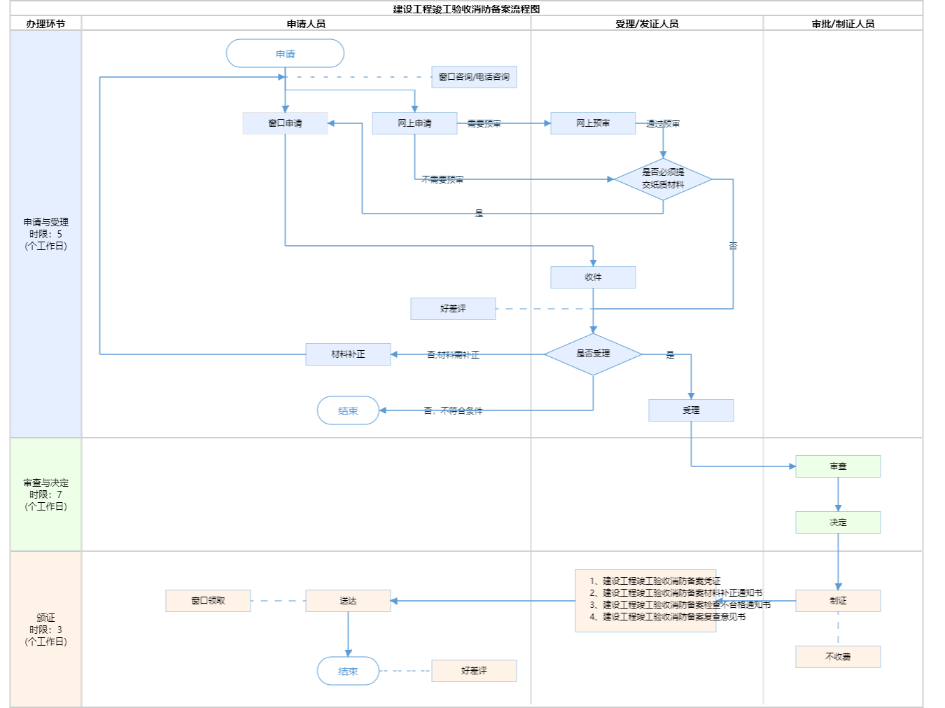 办件承诺办结时限说明:依法需要听证、检验、检测、鉴定的,需要协调消防车等大型救援设备开展现场检查的,所需时间不计算在内。对于重大、复杂的工程,消防验收办结时限按照国家法定时限执行。告知承诺办结时限为0.5个工作日。(承诺时限为办理流程中“审查与决定”环节的计时时限)