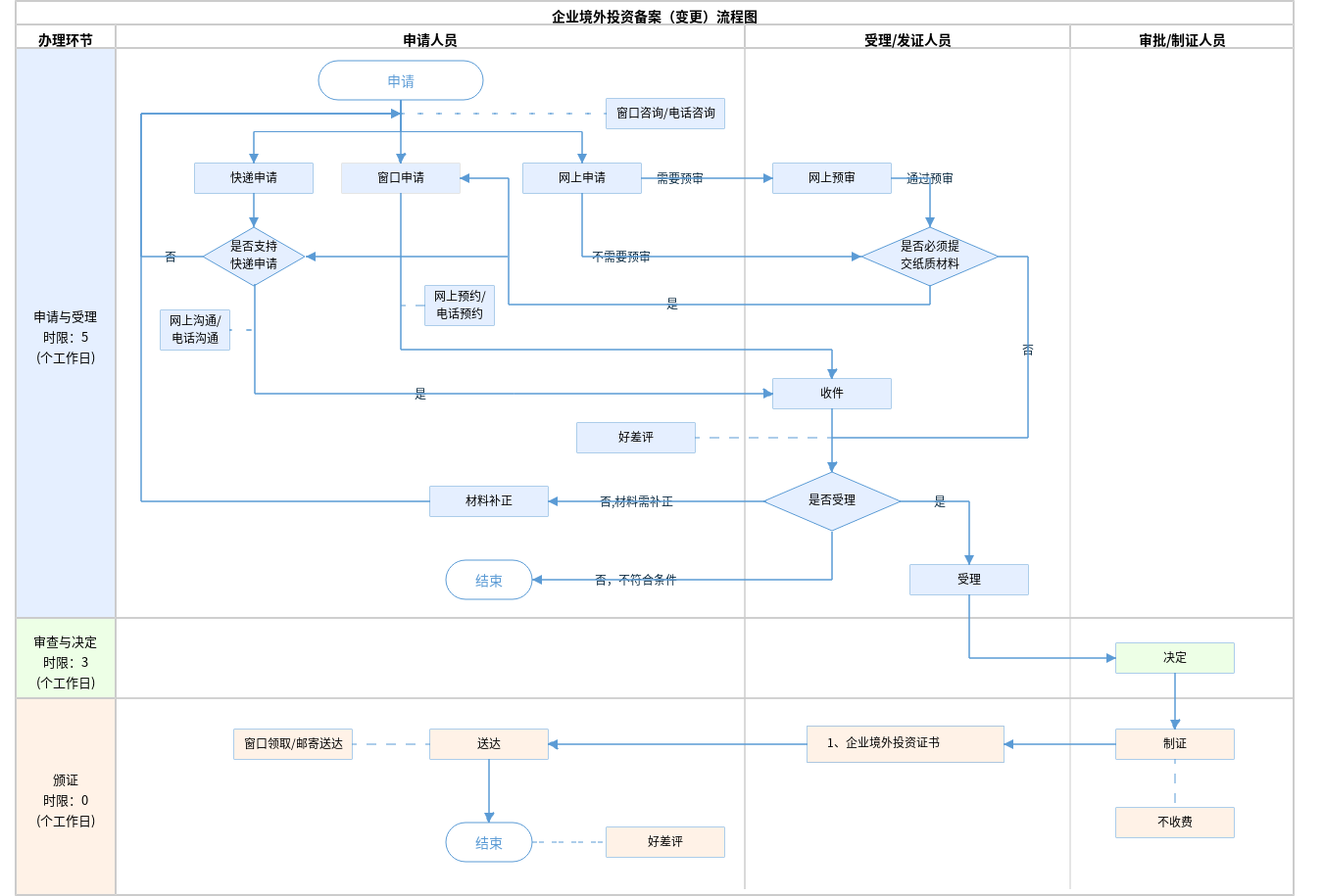 企业需要通过商务部业务系统统一平台-对外投资合作信息服务系统填写《境外投资备案表》并上传提交相关真实性审核材料。我局对提交的材料进行真实性审核,通过的予以受理,受理后三个工作日出具备案结果。不通过的告知企业未通过或告知需补充提交的材料。(承诺时限为办理流程中“审查与决定”环节的计时时限)