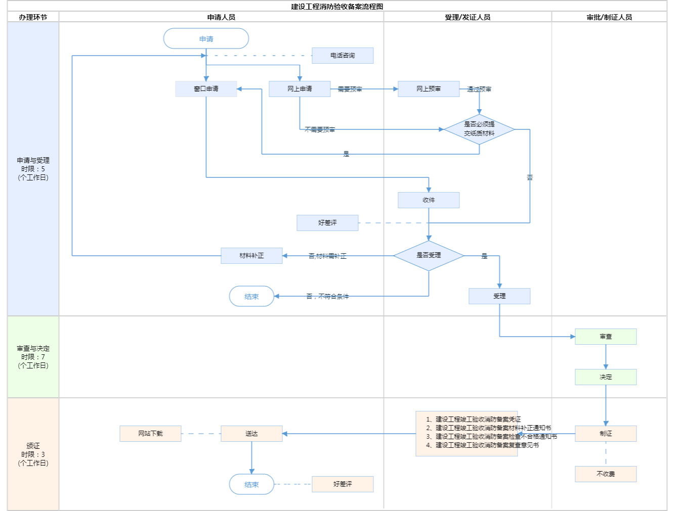 办件承诺办结时限说明:依法需要听证、检验、检测、鉴定的,需要协调消防车等大型救援设备开展现场检查的,所需时间不计算在内。对于重大、复杂的工程,消防验收办结时限按照国家法定时限执行。告知承诺办结时限为0.5个工作日。(承诺时限为办理流程中“审查与决定”环节的计时时限)