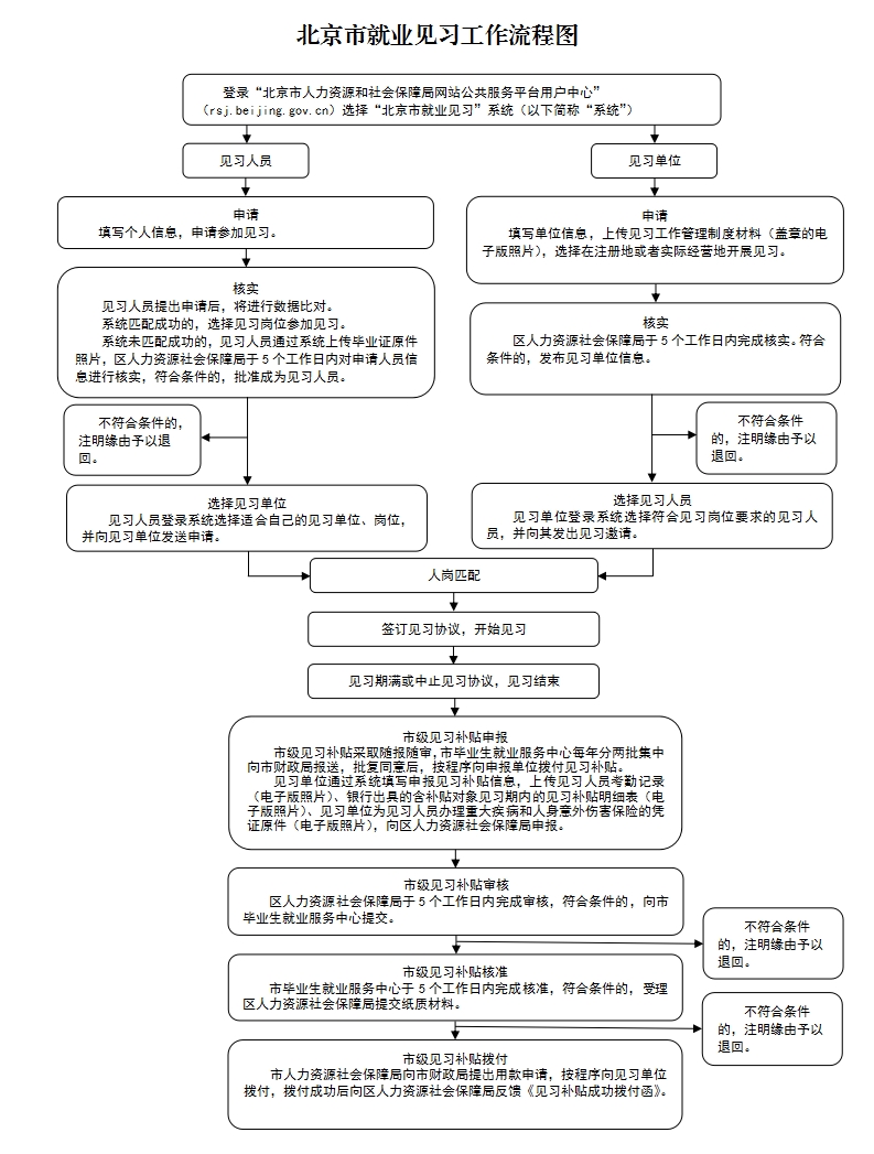| 受理条件 | 第三章 见习单位 第六条 见习单位是指依法生产经营,具备提供见习服务能力,能够为见习人员提供实岗锻炼机会的北京地区各类型企事业单位、社会组织。 第七条 申报见习单位应同时符合下列条件: (一)在本市登记注册,经营状况良好,管理规范,社会责任感强; (二)能够提供稳定、良好的办公环境,能够提供综合管理、项目策划、企业运营、投融资、创业创新等岗位; (三)有专设的人力资源管理部门或专职人员、专门的见习指导人员和见习管理计划; (四)能够为见习人员提供一定生活补助和工作生活上的便利; (五)能够提供必要的劳动防护用品 第四章 见习人员 第十一条 见习人员应满足以下条件之一: (一)毕业2年内未就业的北京生源高校毕业生、中专毕业生及技工院校毕业生; (二)具有本市户籍的16至24岁登记失业人员; (三)具有本市户籍的16至24岁转移就业登记的农村无业或务农劳动力。(来源:《关于印发<北京市就业见习工作管理办法>的通知》(京人社毕发〔2019〕63号)第三章 见习单位和第四章 见习人员相关内容,申请内容要与实际情况一致,填写完整准确。) | ||