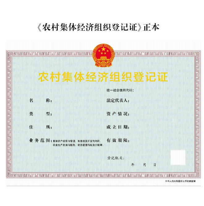 3.(五)《农村集体经济组织登记证》的发放要严格履行农村集体经济组织登记赋码程序和手续,确保依法依规。登记证发放前要严格审核相关材料,并对农村集体经济组织名称、类型、住所、法定代表人、资产情况、业务范围、成立日期、有效期限、发证日期等信息进行认真核查,核实无误后通过登记赋码管理系统打印登记证。(六)农村集体经济组织的名称原则上由县级以下行政区划和改革类型依次组成。组级集体经济组织名称统一为“××县(市、区)××乡(镇、街道)××村(社区)××组股份经济合作社(经济合作社)”,村级集体经济组织名称统一为“××县(市、区)××乡(镇、街道)××村(社区)股份经济合作联合社(经济联合社)”,乡镇级集体经济组织名称统一为“××县(市、区)××乡(镇、街道)股份经济合作联合总社(经济联合总社)”,名称中县级行政区划为市辖区的,应与其所在地市名称连用。仅有村级集体经济组织的,名称也可以称为××村(社区)股份经济合作社(经济合作社)。农村集体经济组织的印章、银行账户等所使用的名称,应当与登记证中的名称相同。(七)《农村集体经济组织登记证》记载的事项中,登记类型统一为“集体经济”,资产情况包括“集体土地总面积”和“资产总额”等。农村集体经济组织的业务范围统一为“集体资产经营与管理、集体资源开发与利用、农业生产发展与服务、财务管理与收益分配等”。组织成立日期为农村集体经济组织第一次取得登记证(包括先期已经取得组织机构代码和地方自行编码发证)的发证日期。按照本通知要求办理登记赋码、换证赋码、变更登记后取得的登记证,自发证之日起10年内有效。(八)农村集体经济组织在办理登记赋码时,需要填写集体资产、改革时点量化资产等相关信息。其中,集体土地总面积为农民集体所有的农用地、建设用地、未利用地的面积总数,资产总额为农民集体所有的流动资产、农业资产、长期资产、固定资产、其他资产等账面资产总额,净资产总额为集体资产总额减去负债后的差额(即所有者权益),资本为农村集体经济组织实际收到投入的资本总额,股本总额为完成农村集体产权制度改革的集体经济组织在改革时点全部股份对应的量化集体资产金额。(来源:农业农村部办公厅关于启用农村集体经济组织登记证有关事项的通知(农办政改〔2018〕3号))
