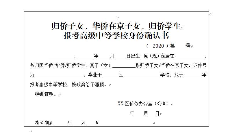 归侨子女、华侨在京子女、归侨学生报考高级中等学校身份确认书-华侨子女身份确认