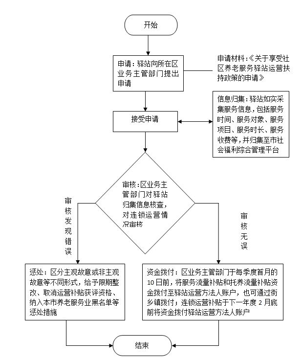 第六章 补贴程序 第十六条 驿站应向区民政局提交享受驿站运营扶持申请。 驿站运营扶持补贴获取资格被取消或中断的,驿站需重新提交享受驿站运营扶持申请。 第十七条 驿站具备以下基本条件的,可申请享受驿站运营扶持政策。(一)驿站与基本养老服务对象签订服务协议。(二)按规定购买综合责任险、雇主责任险等相关保险。(三)未有驿站管理负面清单及相关禁止性规定情形。(四)按规定为责任片区内基本养老服务对象提供四项基本养老服务项目。(五)执行突发事件报告制度。(六)服务质量星级评定为一星级及以上。新开业运营的驿站,可享受自开业运营之日起一年内的运营补贴。开业运营一年后仍未取得星级资格的,取消驿站托养补贴、连锁运营补贴及星级叠加部分基础补贴获取资格。 来源于《北京市社区养老服务驿站运营扶持办法》(京民养老发〔2021〕154号)