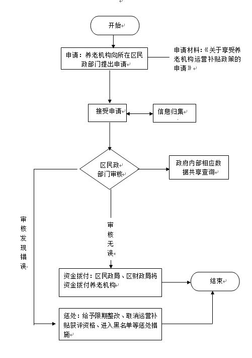 | 受理条件 | 1.满足以下条件的养老机构发放运营补贴。 (一)养老机构每年3月31日之前向民政部门提交上一年度的工作报告和具有资质的会计师事务所出具的财务状况审计报告。 (二)按规定购买养老机构综合责任险、雇主责任险等相关保险。 (三)执行突发事件报告制度。 (四)未发生重大责任事故。 (五)从业人员持有资格证书或接受岗前培训率达到100%。 (六)服务质量星级评定为一星级及以上。因新注册登记一年内暂时难以参加服务质量星级评定的机构,可以申请享受开业运营一年半内的运营补贴。 (七)遵守国家环境质量方面标准,未对周边生态环境造成重大不良影响。 (八)服务对象年度满意率达到85%以上。(来源于:《北京市养老机构运营补贴管理办法》第十二条) 2.材料齐全,填写完整。 | ||
