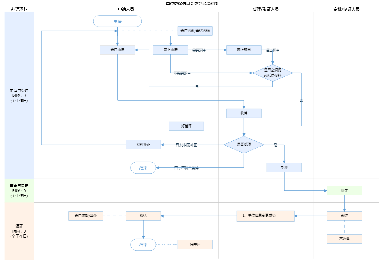 | 受理条件 | (1)已开通网上申报(社保网申或医保公共服务平台)的单位,网上申报可直接变更的有:单位简称、邮政编码、单位经办人姓名、电话、所在部门、单位法人联系电话、单位电子邮件地址、单位网址、单位传真号码、单位类别、经济类型、单位办公地址、银行缴费信息、支付银行、户名及支付账号等。网上提交成功即时办理成功。 (2)也可以使用北京市社会保险信息系统企业管理子系统─普通单位版申报办理:登录北京市医保局官方网站,下载并安装“北京市社会保险信息系统企业管理子系统(普通单位版)”最新版程序,通过该系统进行单位信息的变更并生成变更电子报盘数据,同时打印《北京市社会保险单位信息变更登记表》一式两份,持该表格及报盘文件去各区医(社)保经办机构申请办理。 | ||
