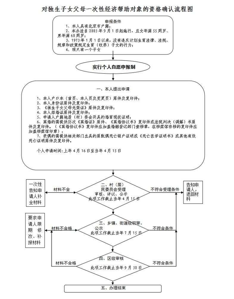 二、关于独生子女意外伤残、死亡后,对其父母的经济帮助 (一)领取条件: 1、独生子女父母凭《光荣证》、子女伤残或死亡的有效证明和双方单位证明(无单位的由户籍所在地村、居委会出具证明)领取。 2、“独生子女发生意外伤残致使基本丧失劳动能力的”的标准,参照北京市计划生育委员会和北京市卫生局《关于远郊区、县农民夫妇一方伤残申请生育第二个子女的规定》的附件“北京市远郊区、县农民夫妇一方伤残申请生育第二个子女审批标准”的第二项执行,由北京市计划生育委员会和北京市卫生局规定的市、区(县)指定医院进行检查鉴定。 (按照新修订文件为:“独生子女发生意外伤残致使基本丧失劳动能力”的标准,参照北京市人口和计划生育委员会 北京市卫生局《关于下发<北京市远郊区、县农村居民夫妇一方伤残申请生育第二个子女的规定〉的通知》(京人口发〔2004〕9号)规定执行。) (二)发放办法: 1、独生子女的母亲年满五十五周岁时,独生子女的父亲年满六十周岁时领取。 2、此项经济帮助,由领取人员户籍所在地的区、县人民政府发放。(来源:关于落实《北京市人口与计划生育条例》规定的有关奖励问题的通知)