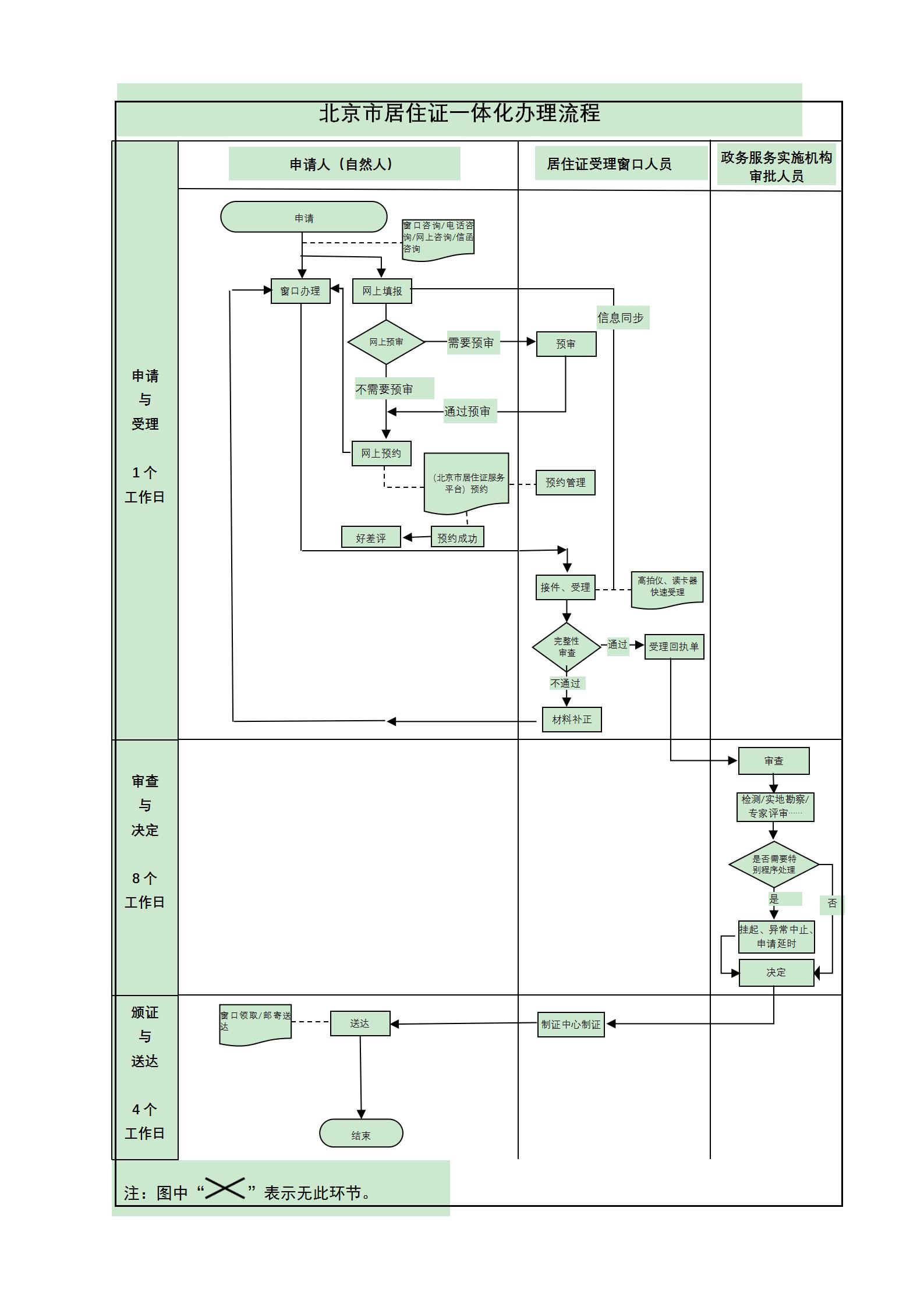 1.申报暂住登记。来京人员提供证件、材料齐全,符合要求的,当场领取《北京市居住登记卡》。 2.申领《北京市居住证》。来京人员提供证件、材料齐全,经审核符合申领条件的,自受理之日起8个工作日内制发《北京市居住证》。因特殊情况不能按期制发的,延长至30日。(承诺时限为办理流程中“审查与决定”环节的计时时限)