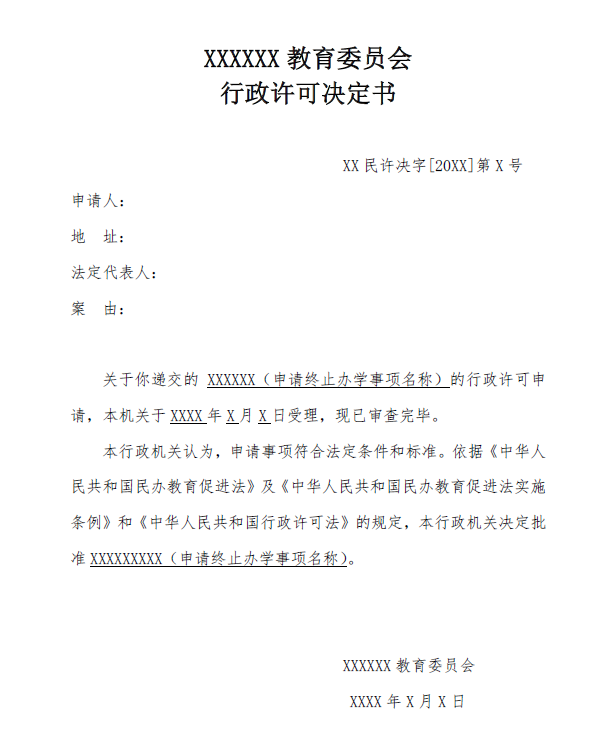 实施学历教育、学前教育、自学考试助学及其他文化教育的民办学校根据学校章程规定要求终止的审批