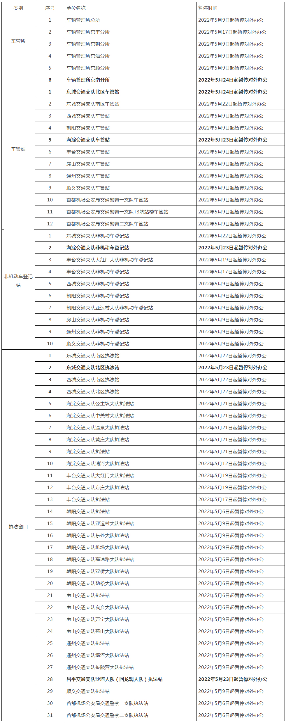 为进一步落实新冠肺炎疫情防控工作要求,配合属地做好疫情风险排查,保护办事群众身体健康,本市以下执法、车管窗口暂停对外办公,市民群众可通过交通安全综合服务平台(http://bj.122.gov.cn/)和“交管12123”APP、“北京交警”APP等网办平台在线处理交通违法、办理车驾管业务。