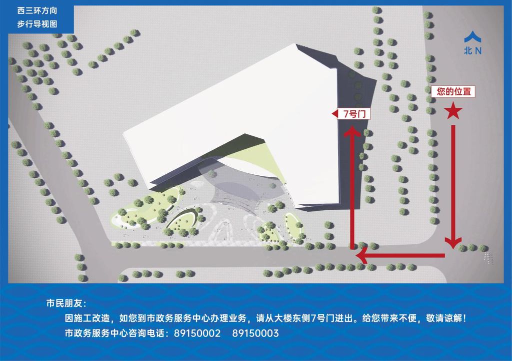 因施工改造,自2024年9月12日起,如您到北京市政务服务中心(西三环南路1号)办理业务,请从大楼东侧7号门进出。24小时自助服务区在施工期间的非工作时间暂停使用,给您带来不便,敬请谅解!