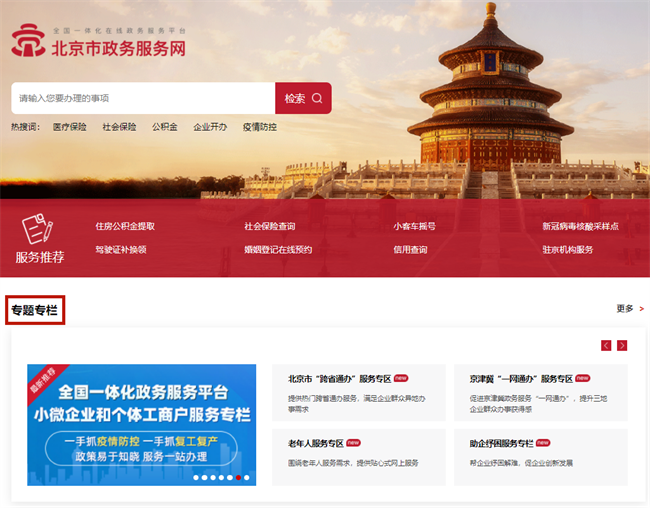 图3:北京市政务服务网首页的“专题专栏”入口