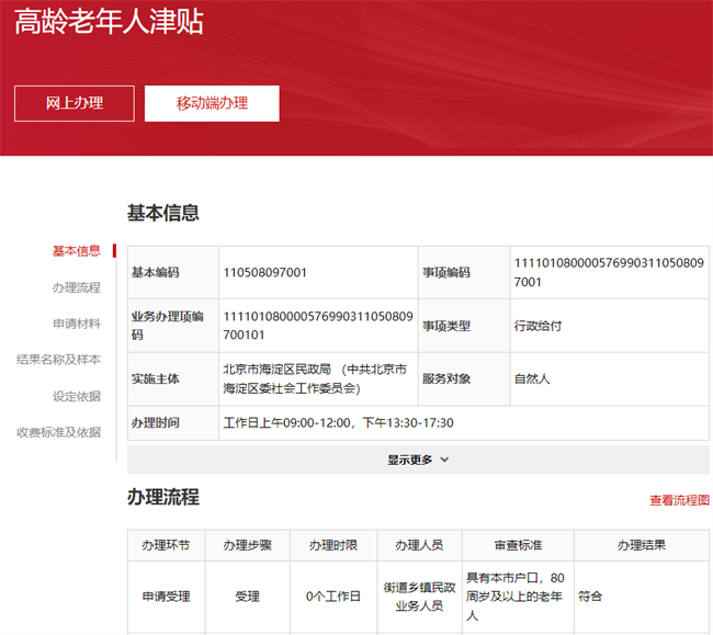 在办事指南页面,可以看到办理“高龄老年人津贴”的流程、申报材料、收费标准等信息,并提供网上办理和移动端办理入口,可直接在线办理(图7)。