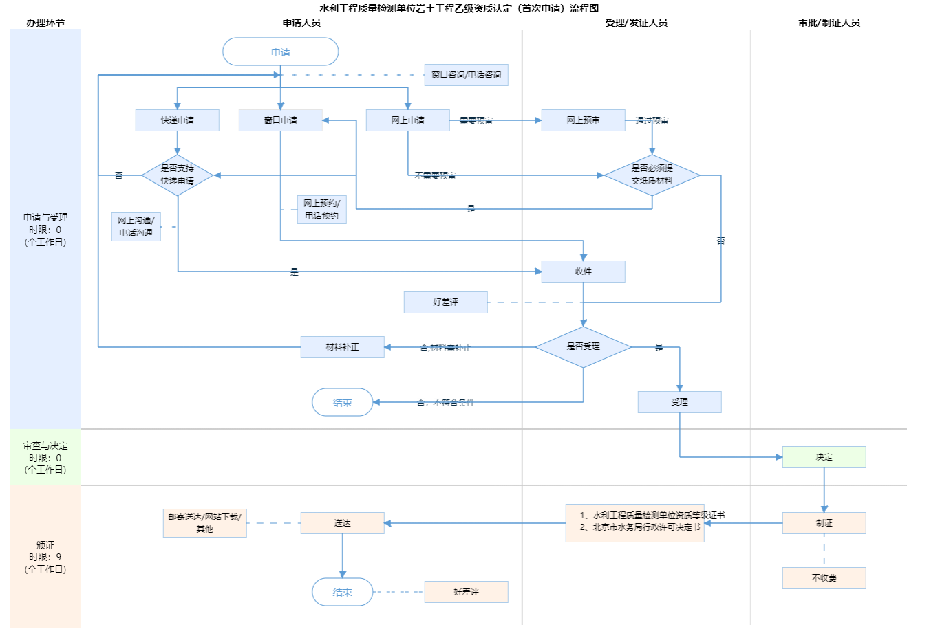 | 受理条件 | 《水利工程质量检测管理规定》(水利部令 第36号) 第四条 从事水利工程质量检测的专业技术人员(以下简称检测人员),应当具备相应的质量检测知识和能力,并按照国家职业资格管理或者行业自律管理的规定取得从业资格。第十一条 检测单位发生分立的,应当按照本规定重新申请资质等级。 申请人申请的事项属于本行政机关的法定职责和权限范围(详见“行使内容”)。 申请人提交的申请材料齐全,符合材料受理标准(详见“申请材料”)。 | ||