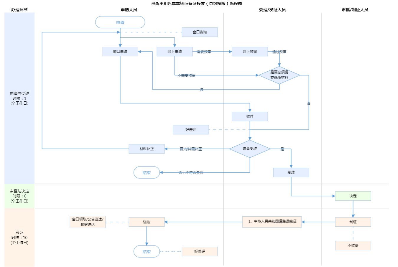 | 受理条件 | 一、巡游出租汽车运力变更 (一)申办的出租汽车经营者已取得北京市巡游出租汽车经营许可,且合法、有效 (二)符合本市出租汽车更新为纯电动车资金奖励政策拟新增运力的,申请人已取得限定期限奖励经营权配置指标确认通知书,确认通知书合法、有效 (三)申请人拟将巡游车运力从事网约车经营的,对应车辆已办理巡游出租汽车退出运营手续,且不为本市出租汽车更新为纯电动车资金奖励政策的奖励经营权指标 (四)使用巡游出租汽车运力从事网约车运营的巡游出租汽车经营者,拟将运力恢复从事巡游车经营的,相关车辆已办理网络预约出租汽车退出运营手续 (五)申请人拟减少运力的,对应车辆已办理巡游出租汽车或网络预约出租汽车退出运营手续 二、巡游出租汽车车型核验(含新增、更新、网转巡) (一)申办的出租汽车经营者已取得北京市巡游出租汽车经营许可,且合法、有效 (二)车辆符合本市规定的车型、车身颜色 (三)申办巡游出租汽车新增纯电动车辆车型核验手续的,应在取得车辆经营权配置指标确认通知书后180天内办理 (四)申办巡游出租汽车更新车辆车型核验手续的,还需满足以下条件: 1.被更新车辆已办理完毕巡游出租汽车退出运营手续 2.无正当理由被更新车辆连续停运不超过180天(车辆报废的以公安交管部门出具注销机动车登记决定书之日起算;车辆出售的以二手车销售统一发票开具日期起算) 3.申请人已取得的奖励经营权配置指标在有效期内 (五)申办网络预约出租汽车转巡游车运营手续的,还需满足以下条件: 1.办理车辆具有合法、有效的本市巡游车辆经营权,且已办理完网约车退出运营手续 2.无正当理由,具有本市巡游车辆经营权车辆连续停运不超过180天(以网约车退出运营手续办结之日起算) (六)各区个体出租管理部门负责辖区个体巡游出租汽车经营者本事项业务申办 三、巡游出租汽车车辆运营证核发(含车辆恢复经营) (一)申请人已取得本市巡游出租汽车经营许可,且合法有效 (二)车辆已安装符合规定的计程计价设备、具有行驶记录功能的车辆卫星定位装置、应急报警装置 (三)车辆应当符合《巡游出租汽车经营服务管理规定》对车辆车型、营运设施、标志标贴、安防设备的要求 (四)车辆经本市交管部门车辆安全检测合格 (五)车辆经辖区交通运输主管部门现场勘验合格 (六)车辆已按规定张贴价标等配套营运标志标识 (七)已停驶的巡游出租汽车申请车辆复驶的通过本事项办理 (八)申请人已取得的奖励经营权配置指标在有效期内 (九)各区个体出租管理部门负责辖区个体巡游出租汽车经营者本事项业务申办 四、巡游出租汽车车辆暂停经营 (一)申请办理本事项的出租汽车经营者已取得本市出租汽车经营许可,且合法、有效 (二)拟停驶车辆已取得本市营运资格,且合法、有效 (三)各区个体出租管理部门负责辖区个体巡游出租汽车经营者本事项业务申办 五、巡游出租汽车车辆退出运营 (一)申请人已取得合法有效的巡游出租汽车车辆经营权 (二)拟退出运营车辆具有合法有效的市内营运资格 (三)退出车辆已严格按照规定涂掉车身装饰、拆除车内的营运设施 (四)报废车辆已在车辆解体厂完成拆解 (五)退出车辆经辖区交通运输主管部门现场勘验合格 (六)退出车辆已办理完毕报废或出售手续 (七)各区个体出租管理部门负责辖区个体巡游出租汽车经营者本事项业务申办 (八)申请人获得的限定期限的奖励经营权配置指标有效期已到期 六、巡游出租汽车车辆信息变更 (一)申请人已取得合法、有效的巡游出租汽车经营许可 (二)车辆登记信息发生变更的,变更后的车辆应符合本市巡游出租汽车运营要求 (三)个体出租管理部门负责辖区个体巡游出租汽车经营者本事项业务申办 需确认材料是否按照办事指南中所列格式递交 | ||