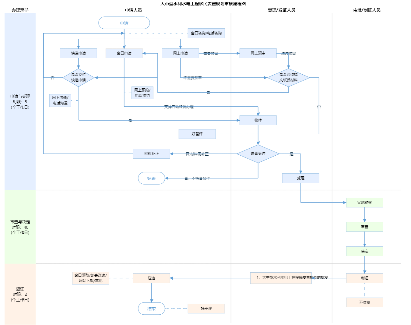 | 受理条件 | 《国务院关于修改<大中型水利水电工程建设征地补偿和移民安置条例>的决定》(中华人民共和国国务院令 第679号)第十条 已经成立项目法人的,由项目法人根据经批准的移民安置规划大纲编制移民安置规划;没有成立项目法人的,项目主管部门应当会同移民区和移民安置区县级以上地方人民政府,根据经批准的移民安置规划大纲编制移民安置规划。大中型水利水电工程的移民安置规划,按照审批权限经省、自治区、直辖市人民政府移民管理机构或者国务院移民管理机构审核后,由项目法人或者项目主管部门报项目审批或者核准部门,与可行性研究报告或者项目申请报告一并审批或者核准。省、自治区、直辖市人民政府移民管理机构或者国务院移民管理机构审核移民安置规划,应当征求本级人民政府有关部门以及移民区和移民安置区县级以上地方人民政府的意见。《水利部关于印发大中型水利水电工程移民安置前期工作管理暂行办法修订意见的通知》(水规计〔2019〕425号)修正)第十四条 移民安置规划应主要包括以下内容:(一)工程占地区、淹没区和移民安置区经济社会发展、自然环境情况;(二)工程占地区、淹没区和淹没线以上受影响范围;(三)工程建设征地实物;(四)农村移民安置规划;(五)城(集)镇迁建规划;(六)企业迁建规划;(七)专项设施处理规划;(八)防护工程建设规划;(九)水库水域开发利用规划;(十)水库库底清理规划;(十一)移民安置区水土保持规划(十二)水库移民后期扶持措施;(十三)征地补偿和移民安置资金估算。 | ||