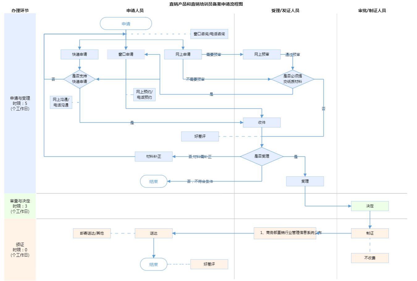| 受理条件 | 1..对直销员进行业务培训的授课人员应当是直销企业的正式员工,并符合下列条件: (一)在本企业工作1年以上; (二)具有高等教育本科以上学历和相关的法律、市场营销专业知识; (三)无因故意犯罪受刑事处罚的记录; (四)无重大违法经营记录。 直销企业应当向符合前款规定的授课人员颁发直销培训员证,并将取得直销培训员证的人员名单报国务院商务主管部门备案。国务院商务主管部门应当将取得直销培训员证的人员名单,在政府网站上公布。 境外人员不得从事直销员业务培训。 (来源:《直销管理条例》第十九条); 2.直销企业向符合《直销管理条例》规定条件的直销员、直销培训员颁发《直销员证》、《直销培训员证》。 直销企业应在每月15日前将本企业上一个月取得《直销培训员证》的人员名册,通过企业所在地省级商务主管部门向商务部备案。未经备案的人员,不得对直销员开展培训。直销培训员只能接受所属企业指派进行培训;(来源:《直销员业务培训管理办法》第四条) 3.直销企业应当根据《直销企业信息报备、披露管理办法》第六条规定,在直销产品上市销售、直销培训员开展培训前,通过商务部直销行业管理信息系统(以下简称信息系统)报备直销产品信息、直销培训员信息,并将《直销产品备案表》、《直销培训员备案表》等书面材料加盖公司印章后,向直销企业注册地省、自治区、直辖市、计划单列市及新疆生产建设兵团商务主管部门(以下简称省级商务主管部门)备案。 直销产品退出市场、直销产品信息发生变更、直销培训员直销的,直销企业应当提前或在相关情形发生之日起10日内通过信息系统报备,并向省级商务主管部门报送书面备案材料;(来源:《商务部关于直销产品和直销培训员备案管理有关事项的通知》第一条) 4.材料齐全,填写完整,真实有效; 5.申请材料按要求签字、盖章,且签章内容与申请材料所载内容一致。 | ||