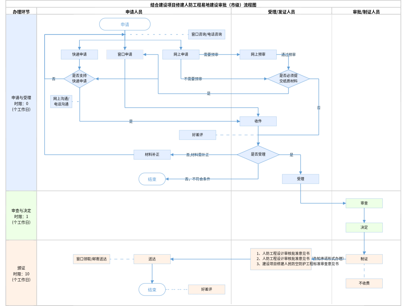 办件承诺办结时限说明:(1)未纳入“多规合一”协同平台项目:①一般方式办理:一般项目10个工作日;规划行政主管部门出具的《规划条件(土地储备供应)》中已包含人防工程规划指标及配套要求的项目7个工作日;列入市级重大建设工程的建设项目5个工作日;遇特殊情况,经实施机关主管领导批准可延长10个工作日;②告知承诺方式办理:1个工作日。承诺时限为办理流程中“审查与决定”环节的计时时限。(2)纳入“多规合一”协同平台项目,与相关部门审核审批手续并行办理,不单独计算时限。(承诺时限为办理流程中“审查与决定”环节的计时时限)