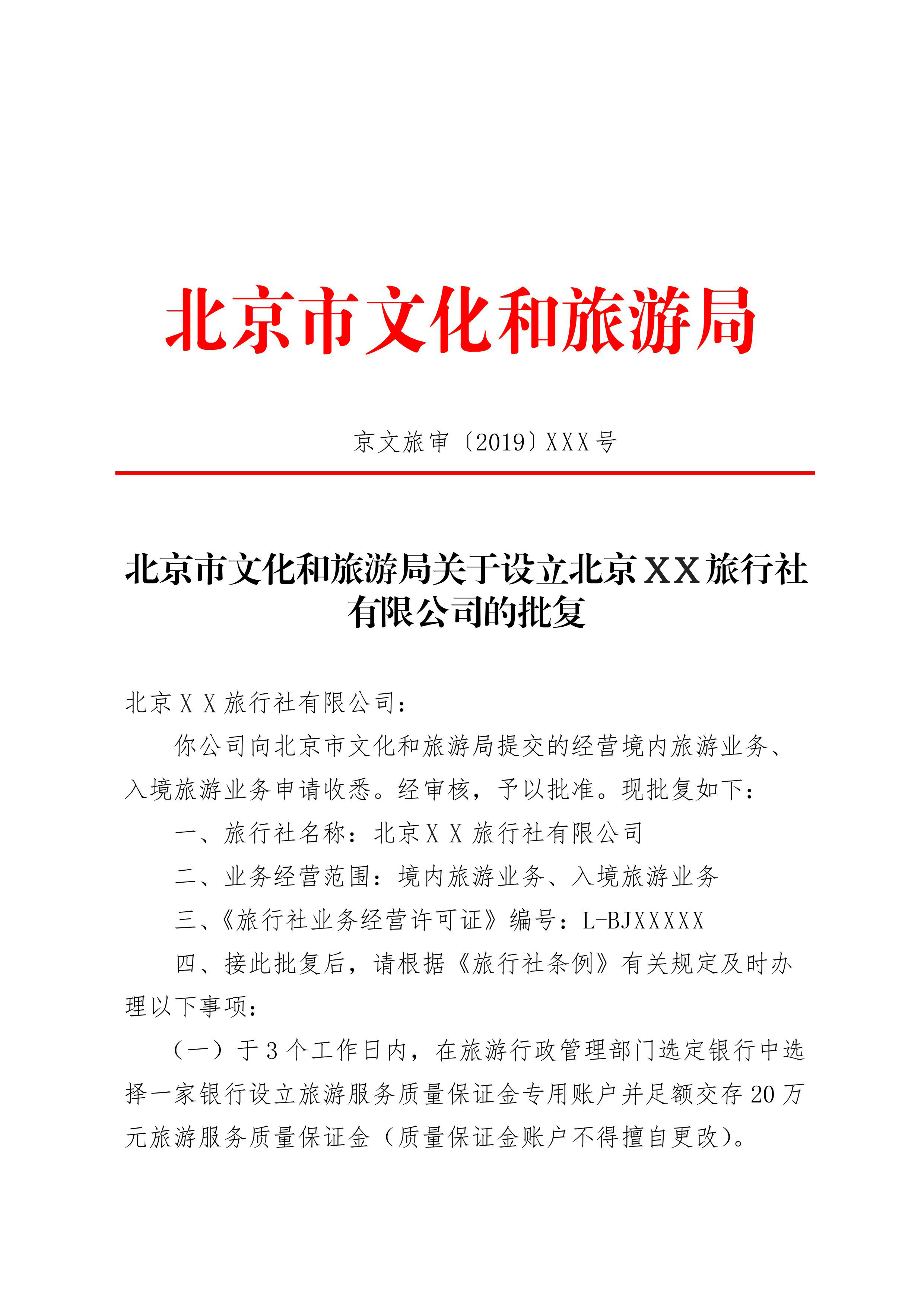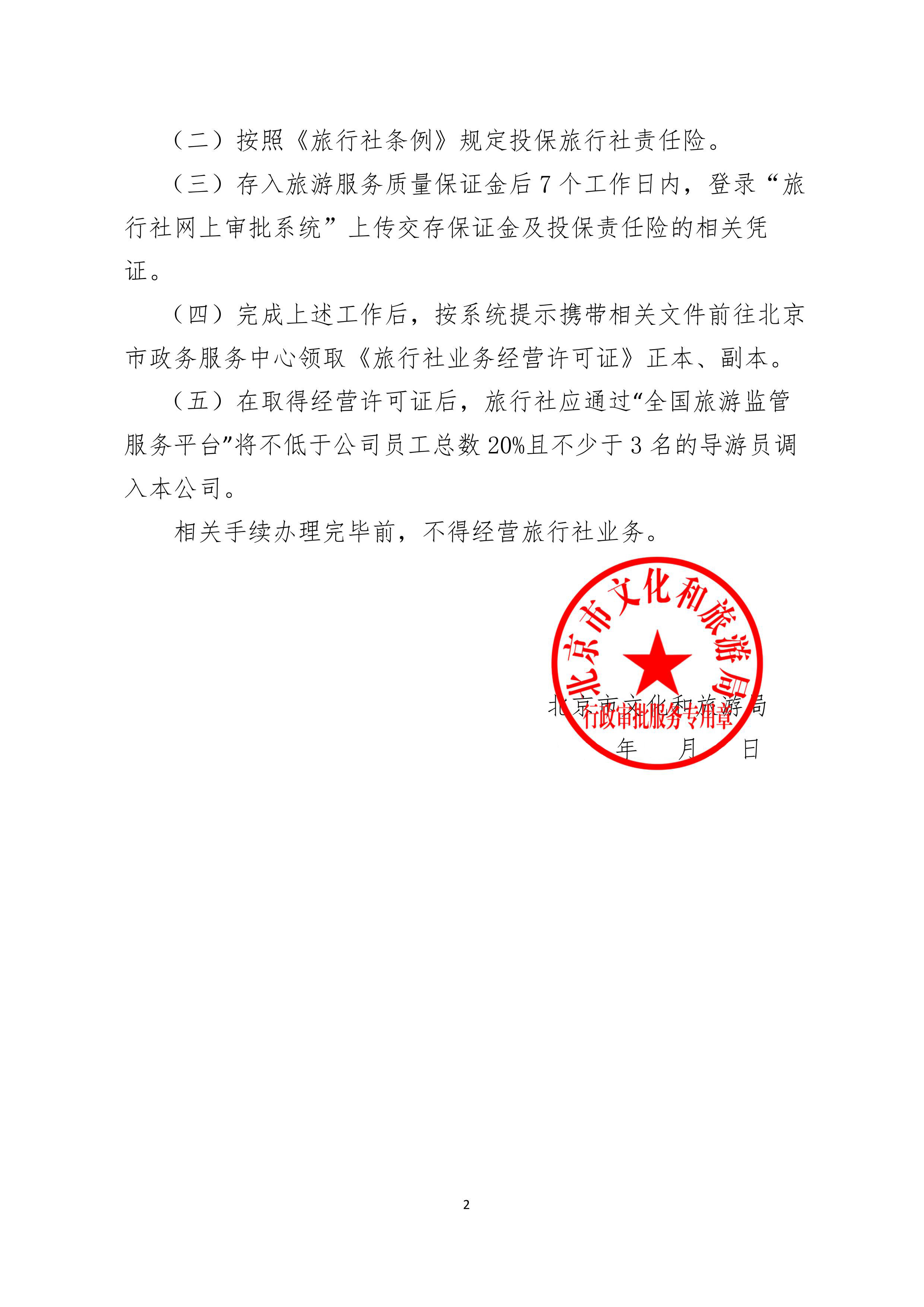 其他要求 | 申请材料总要求 | 1.该事项网上办理,可实行告知承诺制办理。申请人登录北京市旅游行业管理平台(https://banshi.whlyj.beijing.gov.cn/hygl/)选择“设立旅行社”开始申请。如需到现场寻求帮办服务,应携带上述全部材料的纸质原件及相应的电子图片(jpg格式),单位介绍信(加盖企业公章)并提供登录用户名和密码。 2.在领取《旅行社业务经营许可证》后,旅行社应及时交存旅游服务质量保证金,投保旅行社责任保险并备案;还应通过全国旅游监管服务平台(http://jianguan.12301.cn)尽快将必要的导游调入旅行社中。登录账号为申请设立时填写的总经理手机号码,接收手机验证码可登录系统。如无法登录,说明该手机号已在系统中被占用或其他特殊原因,请致电89150050咨询解决方法。 |