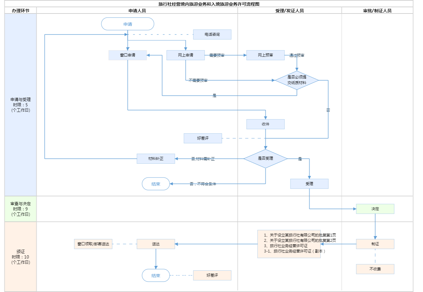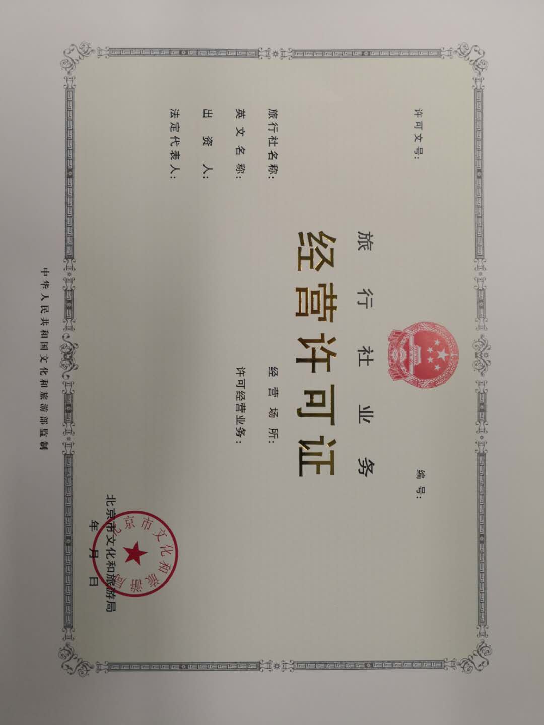 | 受理条件 | 一、申请人应根据《旅游法》《旅行社条例》《旅行社条例实施细则》和《导游管理办法》的规定和要求如实填写申请信息并承担相关法律责任。 二、申请取得《旅行社业务经营许可证》前应当先取得《企业法人营业执照》,执照的经营范围应包括“旅游业务”。 三、设立旅行社应当有不少于30万元的注册资本。 四、申请材料完整准确,形式符合规范。 五、设立旅行社应具备必要的经营管理人员和导游。 “必要的经营管理人员”是指具有旅行社从业经历或者相关专业经历的经理人员和计调人员; “必要的导游”是指有不低于旅行社在职员工总数20%且不少于3名、与旅行社签订固定期限或者无固定期限劳动合同的持有导游证的导游。 | ||