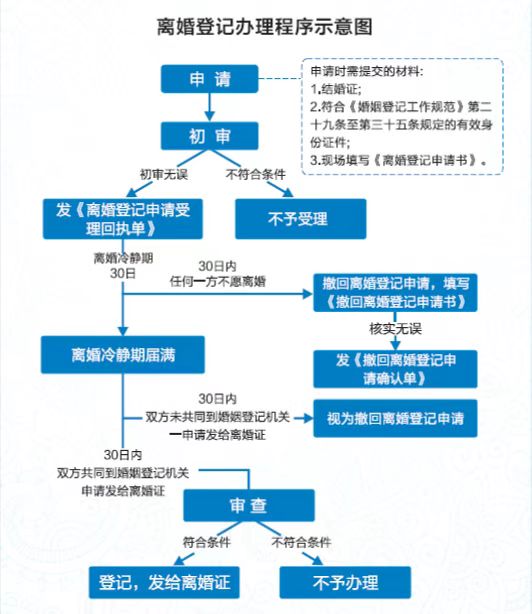 办件承诺办结时限说明:《中华人民共和国民法典》第一千零七十七条规定,自婚姻登记机关收到离婚登记申请之日起三十日内,任何一方不愿意离婚的,可以向婚姻登记机关撤回离婚登记申请。前款规定期限届满后三十日内,双方应当亲自到婚姻登记(承诺时限为办理流程中“审查与决定”环节的计时时限)
