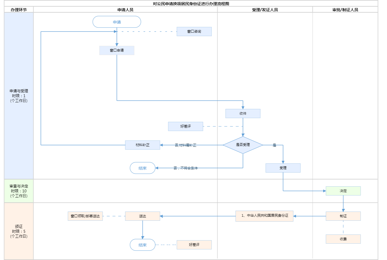 | 受理条件 | 第十一条国家决定换发新一代居民身份证、居民身份证有效期满、公民姓名变更或者证件严重损坏不能辨认的,公民应当换领新证;居民身份证登记项目出现错误的,公安机关应当及时更正,换发新证;领取新证时,必须交回原证。居民身份证丢失的,应当申请补领。(来源:《中华人民共和国居民身份证法》) | ||
