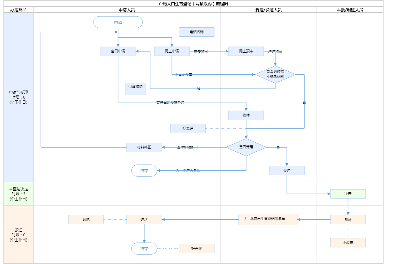 | 受理条件 | 1.夫妻一方或双方为本市户籍人口或非户籍常住人口的,可以在本市进行生育登记,登录“北京市生育登记服务系统”(https://sydj.wjw.beijing.gov.cn/)填写相关信息线上进行登记,或按照以下要求线下进行登记: (一)夫妻一方或双方为本市户籍人口的,到一方户籍地社区村(居)或街道(乡镇)进行生育登记; (二)夫妻双方均为外省市户籍、一方或双方为本市常住人口的,到一方现居住地街道(乡镇)进行生育登记; (三)本市集体户在校男女大学生、驻京现役男女军官、士官(含武装警察部队),参照本市户籍人口的有关规定进行生育登记。 2. 材料齐全,填写完整; 3.提交的证照证件或批复文件齐全完整、如提交复印件,应完整清晰并与原件一致; 4.申请材料信息所载基本信息与提交的证照证件或批复文件所载内容一致; 5.申请材料按要求签字、盖章,且签章内容与申请材料所载内容、提交的证照证件或批复文件 一致。 | ||