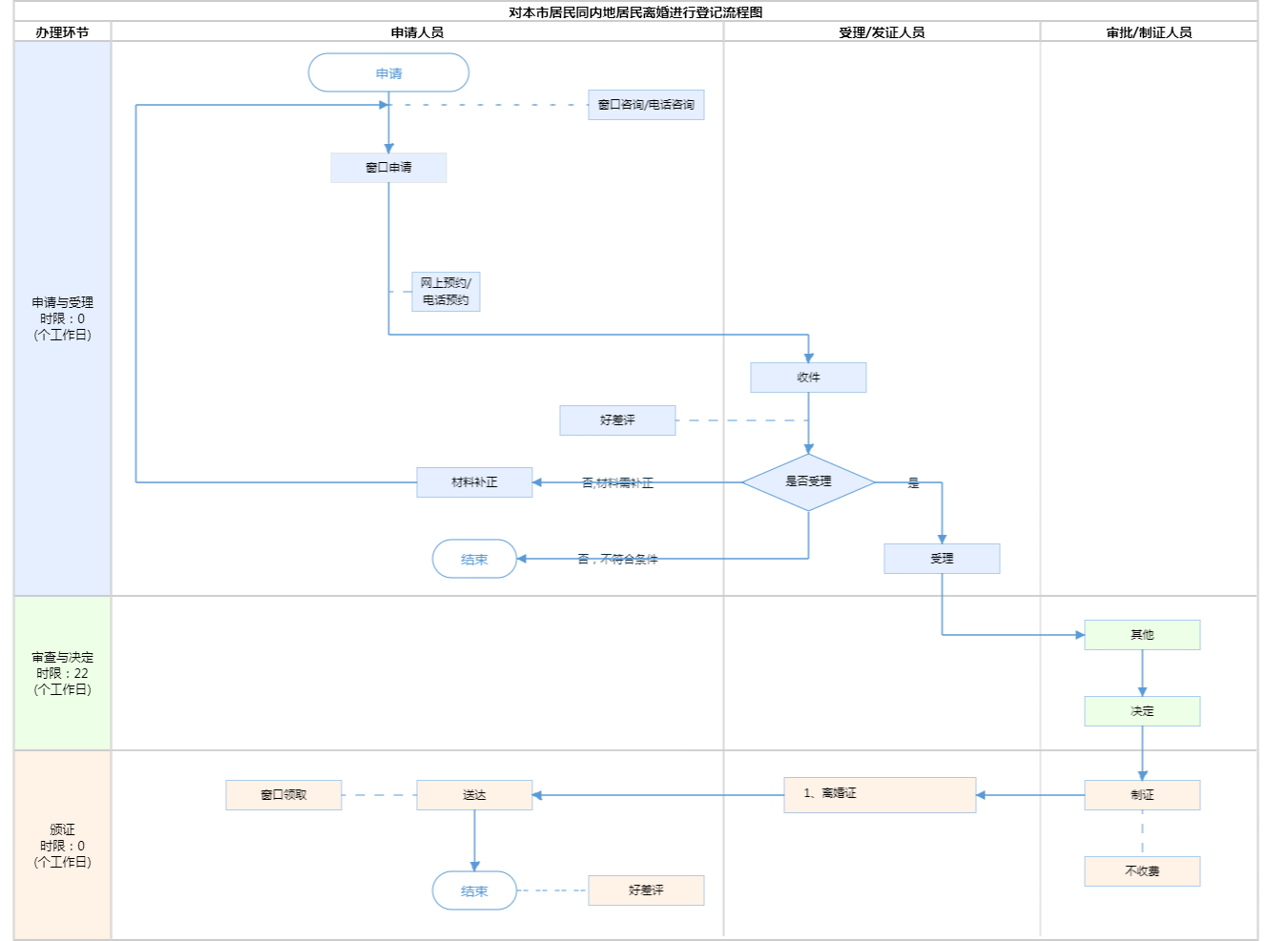 办件承诺办结时限说明:《中华人民共和国民法典》第一千零七十七条规定,自婚姻登记机关收到离婚登记申请之日起三十日内,任何一方不愿意离婚的,可以向婚姻登记机关撤回离婚登记申请。前款规定期限届满后三十日内,双方应当亲自到婚姻登记(承诺时限为办理流程中“审查与决定”环节的计时时限)