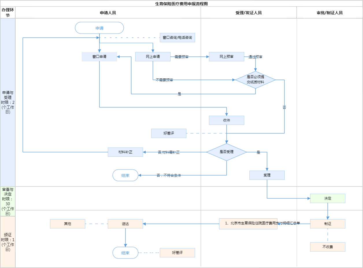 | 受理条件 | 2、生育保险参保职工持社保卡或医保电子凭证结算医疗费用时,定点医疗机构应为享受待遇的生育保险参保职工垫付由生育保险基金支付的医疗费用,向生育保险参保职工收取个人应付费用,并为生育保险参保职工出具相关结算单据。(来源:《关于北京市生育保险参保职工持社会保障卡就医及医疗费用结算有关问题的通知》京医保发〔2013〕34号第二条第一款第2项、《关于持医保电子凭证就医结算流程有关问题的通知》京医保中心发[2020]90号) 3、定点医疗机构应在完成结算后48小时内,通过网络或报盘方式将结算数据上传到生育保险信息系统。(来源:《关于北京市生育保险参保职工持社会保障卡就医及医疗费用结算有关问题的通知》京医保发〔2013〕34号第二条第一款第3项) 4.结算数据填写完整,真实有效。 | ||