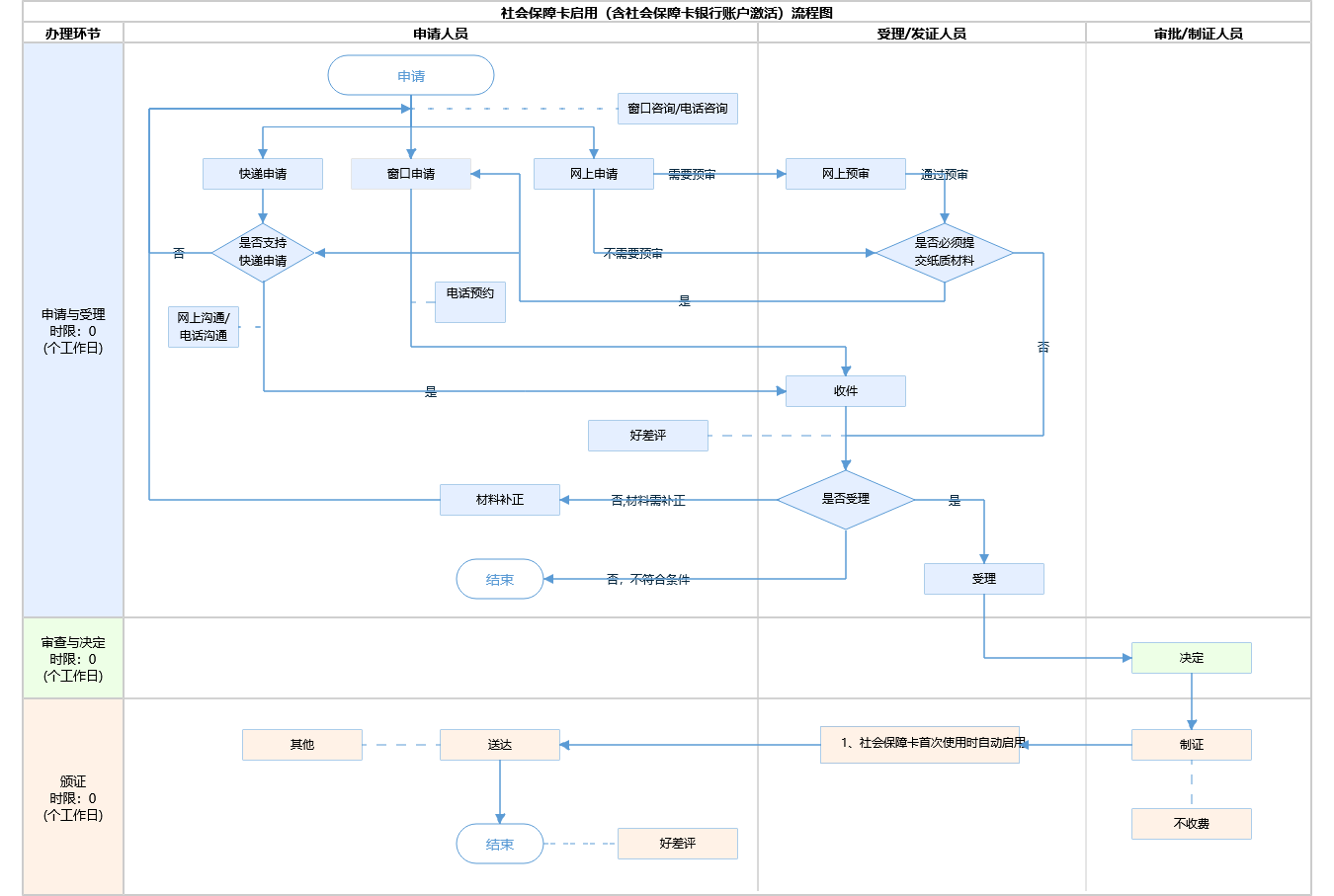 | 受理条件 | 1.发卡地区要按照方便持卡人的原则,制定科学、合理的发放流程,便捷地将社会保障卡发放到持卡人手中。(中华人民共和国人力资源和社会保障部《关于印发“中华人民共和国社会保障卡”管理办法的通知》(人社部发〔2011〕47号)第十三条)2.社会保障卡首次使用时自动启用。3.信息真实有效。 | ||
