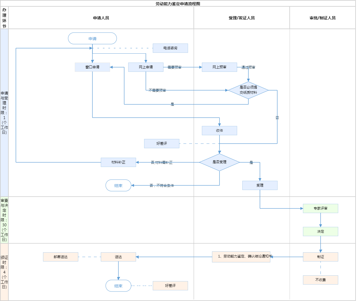 | 受理条件 | 1.职工发生工伤,经治疗伤情相对稳定后存在残疾、影响劳动能力的,或者停工留薪期满(含劳动能力鉴定委员会确认的延长期限),工伤职工或者其用人单位应当及时向设区的市级劳动能力鉴定委员会提出劳动能力鉴定申请。因申请领取病残津贴进行劳动能力鉴定的,因病或非因工致残人员或者其用人单位应当向待遇领取地或者最后参保地的设区的市级劳动能力鉴定委员会提出劳动能力鉴定申请。 (来源:2025年5月13日人力资源社会保障部、国家卫生健康委令第55号公布第七条) 2.申请劳动能力鉴定应当填写劳动能力鉴定申请表,并提交下列材料: (一)有效的诊断证明、按照医疗机构病历管理有关规定复印或者复制的检查、检验报告等完整病历资料; (二)被鉴定人的居民身份证或者社会保障卡等其他有效身份证明原件。 (来源:2025年5月13日人力资源社会保障部、国家卫生健康委令第55号公布第九条) 3.材料齐全,填写完整。 4.提交的证件或批复文件齐全完整,如提交复印件,应完整清晰并与原件一致。 5.申请材料所载基本信息与提交的证件或批复文件所载内容一致。 6.申请材料按要求签字、盖章,且签章内容与申请材料所载内容、提交的证照证件或批复文件所载内容一致。 | ||