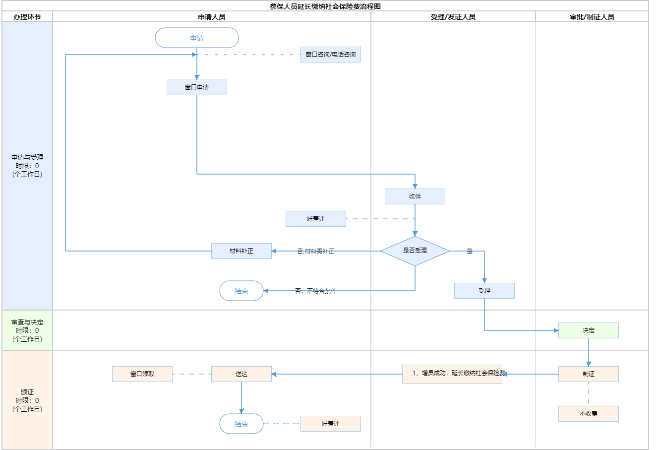 | 受理条件 | (1)符合要求并自愿延长缴纳社会保险费的申请人:①本市户籍人员到达法定退休年龄时,参保单位先到参保地医(社)保经办机构办理医疗保险减员手续。②本市城镇户籍人员到户口所在区人力资源公共服务中心办理存档手续,并由区人力资源公共服务中心持参保人身份证、户口簿原件及复印件到区社保经办机构办理增员手续(本市农业户籍人员、本市无档案人员到户口所在社保所,持以上材料按流程办理),同时完成延长缴纳社会保险费扣款手续。 (2)外埠参保人员人员符合在京领取养老待遇及延期缴费条件的达法定退休年龄时:①参保单位到参保地医(社)保经办机构办理医疗保险减员手续。②外埠户籍人员持参保人身份证、户口簿原件及复印件、《外埠户籍参保人员延长缴纳社会保险费申请表》等材料到用人单位注册地的社保所办理延期手续。社保所审核无误后到持以上材料前往医(社)保经办机构办理增员手续并完成延长缴纳社会保险费扣款手续。 | ||