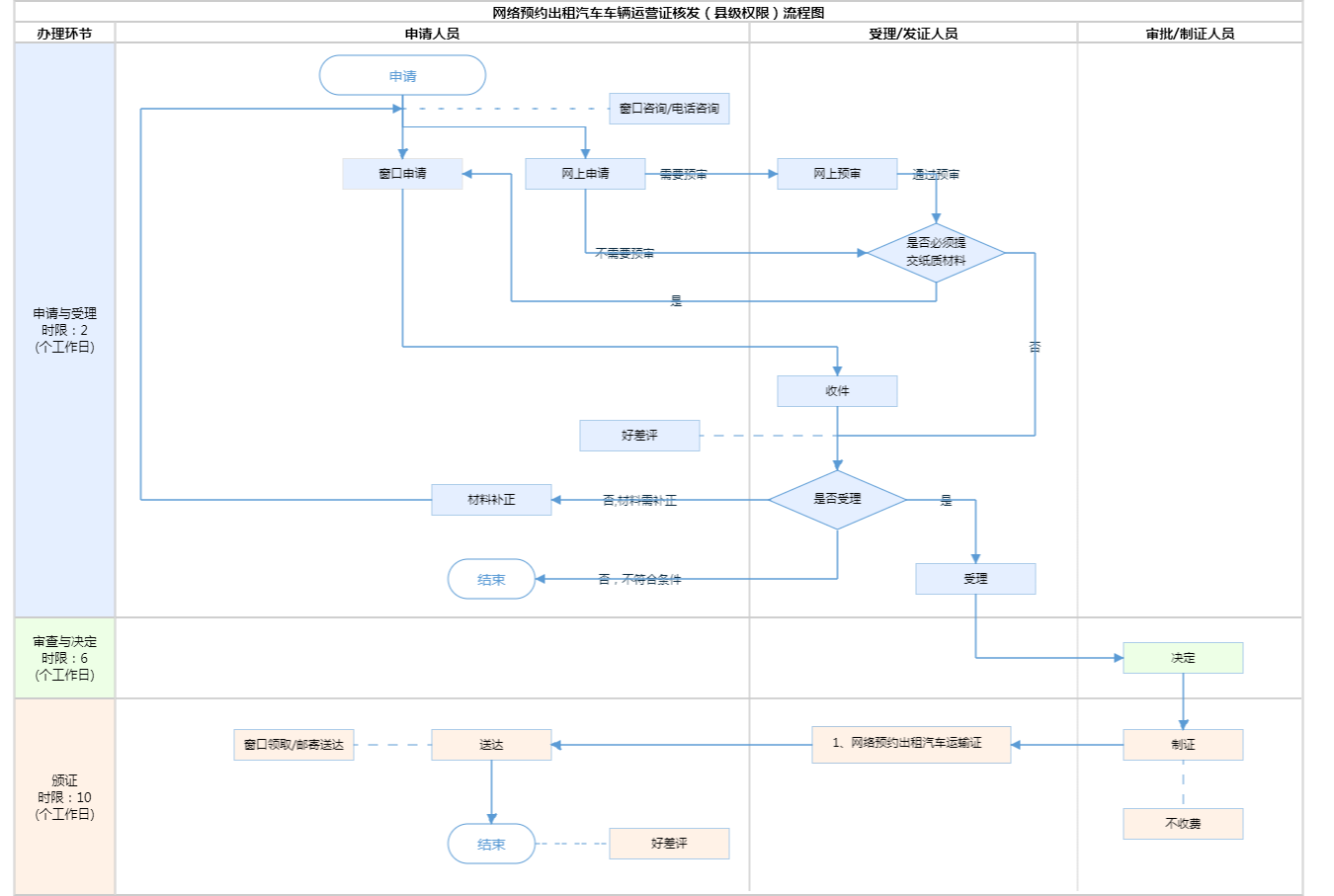 | 受理条件 | 一、网络预约出租汽车车型核验(含新增、巡转网、巡转网更新) (一)此事项由申请人委托协议接入的网约车平台公司负责办理 (二)车辆为本市号牌的7座及以下乘用车或未取得号牌的巡游转网约车辆 (三)车辆为本市出租汽车经营者或个人所有(机关企事业单位及社会团体非营运车辆不得从事网约车运营) (四)车辆满足本市最新公布实施的机动车排放标准 (五)5座三厢小客车车辆轴距不小于2650毫米(含新能源车),排气量不小于1.8升;7座乘用车排气量不小于2.0升、轴距不小于3000毫米) (六)车辆为个人所有的,车辆所有人名下无已登记的巡游车和网约车,且本人已取得《网络预约出租汽车驾驶员证》 (七)车辆行驶里程未达到60万千米且使用年限未超过8年 二、网络预约出租汽车车辆运营证核发 (一)《北京市交通运输政务服务申请表》 (二)车辆所有人为个人的,还需提交以下材料: 1.车辆所有人身份证原件 2.车辆所有人《网络预约出租汽车驾驶员证》(申请人无需提交,由受理人员通过系统获取) (三)车辆所有人为企业的,提交车辆所有企业的营业执照(申请人无需提交,由受理人员通过政府信息共享系统获取电子证照) (四)车辆的《机动车登记证书》、《机动车行驶证》原件及复印件 (五)《网络预约出租汽车治安审验合格凭证》原件 (六)车辆彩色照片(照片要求:照片尺寸:10厘米×6厘米,像素:(1176×N)×(708×N),且N宜大于1。照片样式与行驶证样式一致,可明确辨别机动车牌照号码、专用车身颜色、车辆门饰标贴信息) (七)提供下列对应情形的办理材料: 1.车辆属于巡游车企业的,巡游车企业应与拟接入的网约车平台公司(申办人)签订入网运营意向书或正式入网运营协议 2.车辆属于个人所有的,车辆所有者应与拟接入的网约车平台公司(申办人)签订驾驶员、车辆入网运营意向书或正式劳动合同或协议 (八)经办人身份证原件 三、网络预约出租汽车车辆退出运营 (一)车辆所有人提出车辆退出申请 (二)车辆已取得《网络预约出租汽车运输证》或尚未取得《网络预约出租汽车运输证》但车辆使用性质已变更为“预约出租客运” 四、网络预约出租汽车车辆信息变更 (一)申请人已取得合法、有效的网络预约出租汽车经营许可 (二)车辆登记信息发生变更的,变更后的车辆应符合本市网约车运营要求 (三)网约车平台公司负责本平台所属车辆本事项业务申办 (四)网约车车辆新接入网约车平台公司的,还应满足下列条件: 1.拟接入的网约车平台公司已取得本市核发的合法有效的《网络预约出租汽车经营许可证》,网约车平台公司经营规范、信誉良好、考核合格 2.车辆属于巡游车企业的,巡游车企业与拟接入的网约车平台公司(申办人)签订正式入网运营协议 需确认材料是否按照办事指南中所列格式递交 | ||