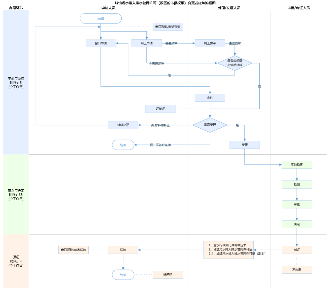| 受理条件 | 《城镇污水排入排水管网许可管理办法》(2015年1月22日中华人民共和国住房和城乡建设部令第21号发布,根据2022年12月1日中华人民共和国住房和城乡建设部令第56号《住房和城乡建设部关于修改<城镇污水排入排水管网许可管理办法>的决定》修正)第十一条 排水许可证有效期满需要继续排放污水的,排水户应当在有效期届满30日前,向城镇排水主管部门提出申请。排水户在排水许可证有效期内,严格按照许可内容排放污水,且未发生违反本办法规定行为的,有效期届满30日前,排水户可提出延期申请,经原许可机关同意,不再进行审查,排水许可证有效期延期5年。第十二条 排水户名称、法定代表人等其他事项变更的,排水户应当在变更之日起30日内向城镇排水主管部门申请办理变更。 申请人申请的事项属于本行政机关的法定职责和权限范围(详见“行使内容”) 申请人提交的申请材料齐全,符合材料受理标准(详见“申请材料”) | ||
